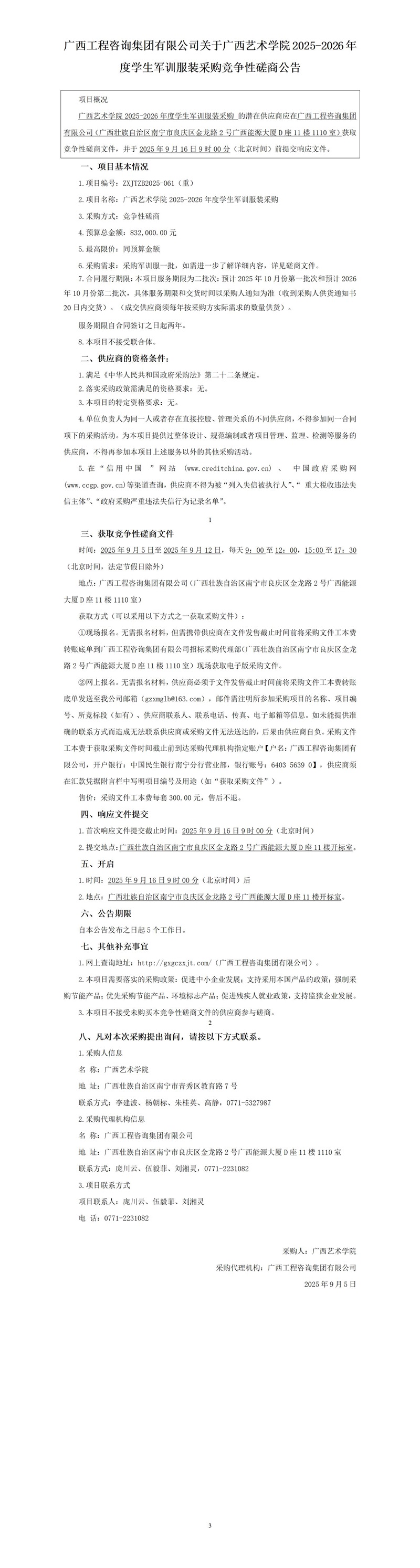 廣西工程咨詢集團有限公司關于廣西藝術學院2025-2026年度學生軍訓服裝采購競爭性磋商公告