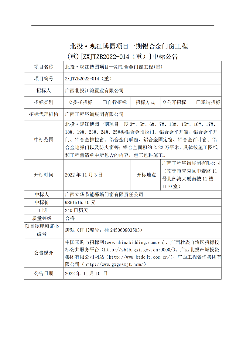 北投·觀江博園項目一期鋁合金門窗工程(重)[ZXJTZB2022-014(重)]中標公告