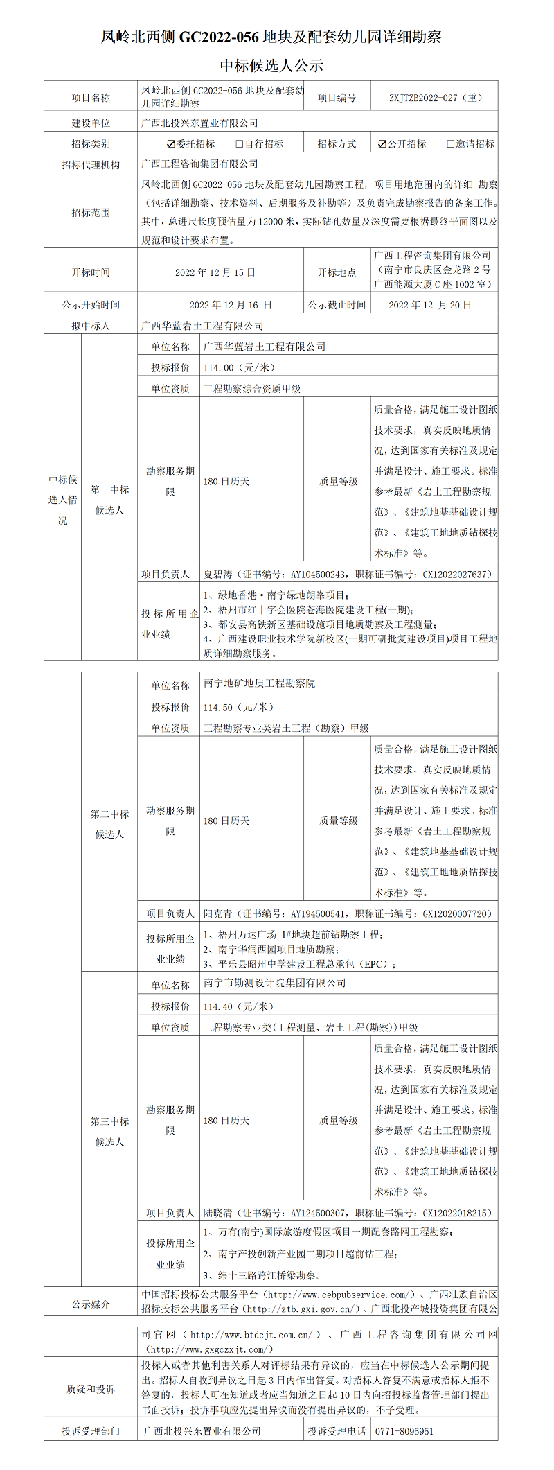 鳳嶺北西側(cè)GC2022-056地塊及配套幼兒園詳細勘察中標候選人公示